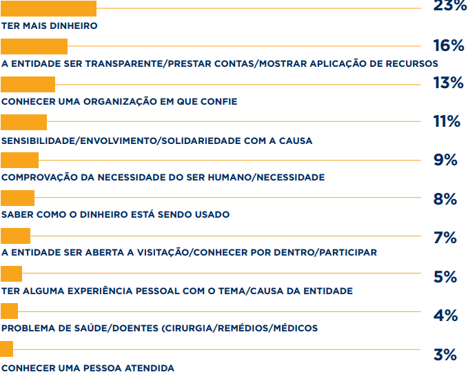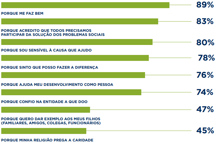 Às vezes, as motivações utilizadas nos argumentos das organizações podem não estar de acordo com o que os doadores realmente querem. Por isso, um dos dados da pesquisa é referente a isso, mostrando o que leva as pessoas a realizar esse tipo de ação. Essa informação pode gerar ideias para você dizer aos clientes sobre quais tipos de mensagem seriam ideais.