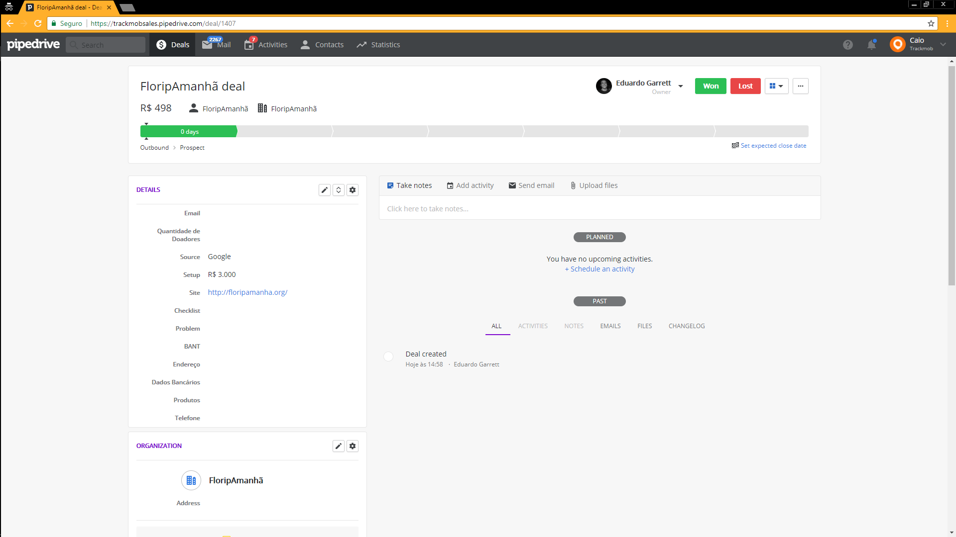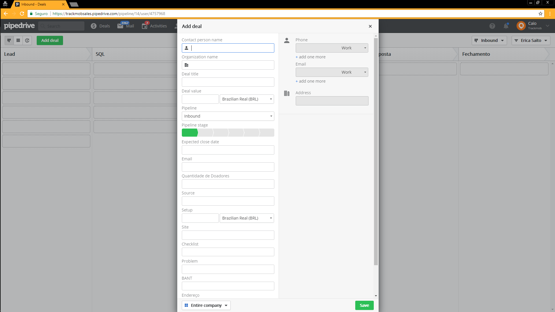 Agora você precisa completar ela com as informações que você tiver sobre o novo Deal, como formas de contato, o valor dele, em que etapa está, se já é qualificado e se faz parte do Inbound ou Outbound.