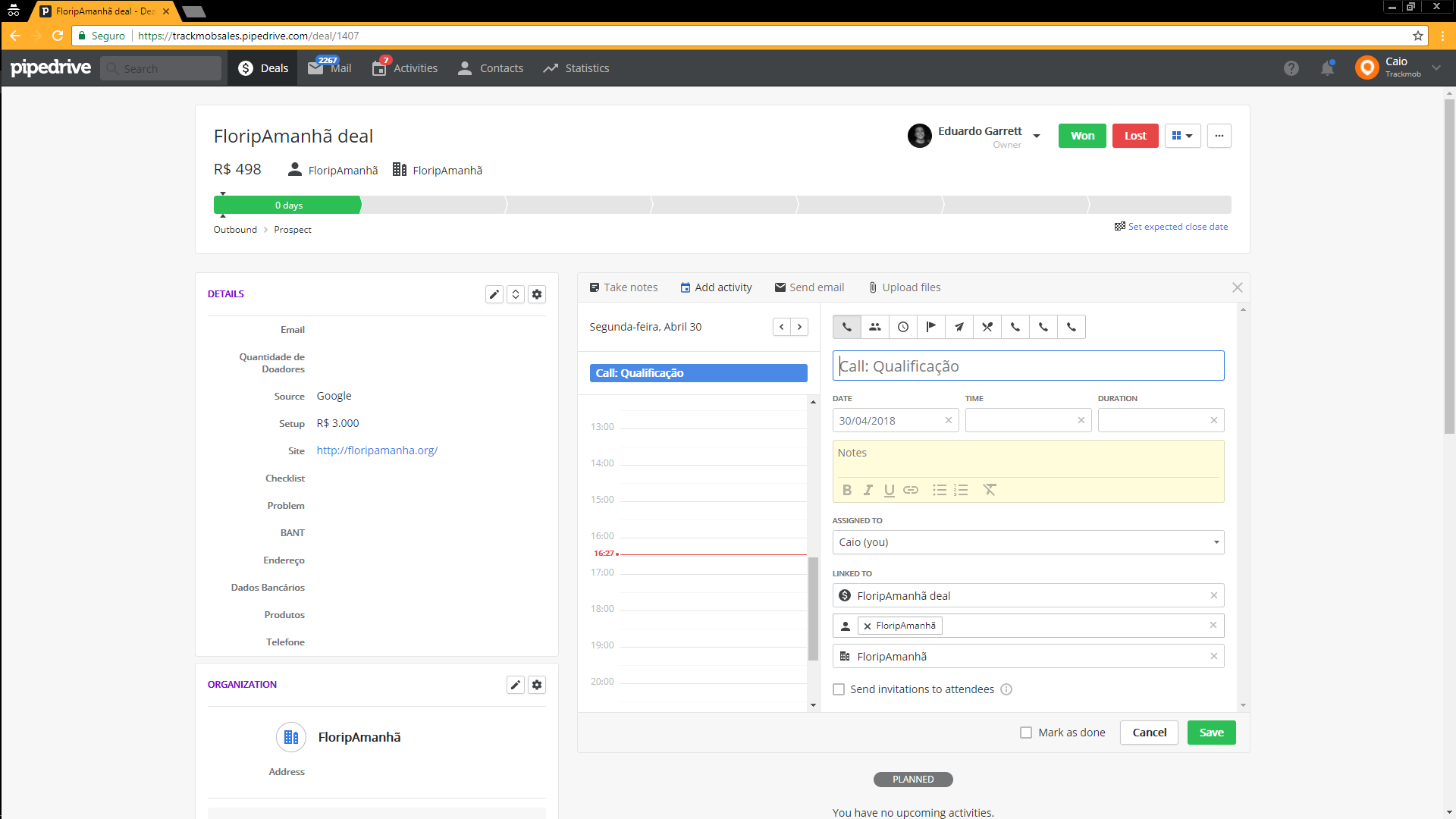 Basta clicar num deles para ver os detalhes que você adicionou. Um dos pontos muito importantes é ver a cor da bolinha que fica ao lado do nome do seu Deal. As cores dizem muita coisa. O vermelho significa que você tem uma tarefa atrasada com aquela pessoa, o verde é o que precisa fazer hoje, o cinza é que tem tarefas agendadas para o futuro e a placa de atenção é que você não agendou nada com aquele Deal.