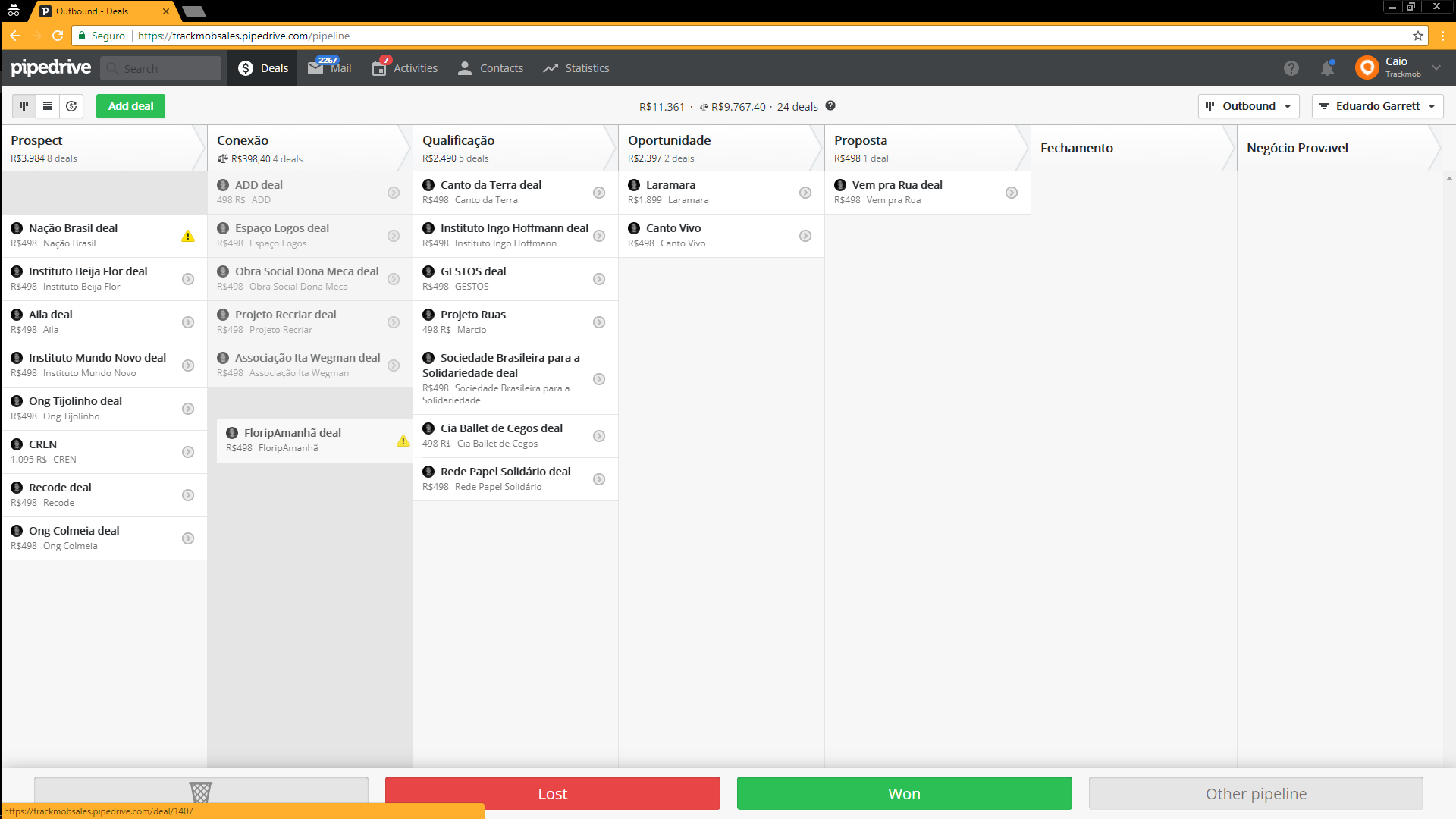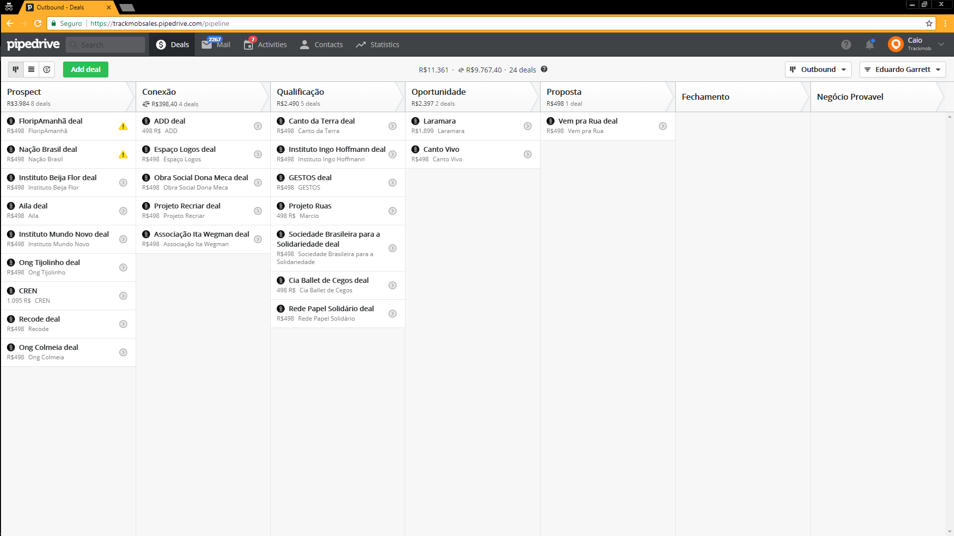 Os quadros já estão dispostos corretamente para que você saiba em que fase está cada prospect. Assim que fechar uma tarefa com ele e sentir que ele já está apto para avançar, basta segurar o card do deal e empurrar para o próximo quadro.