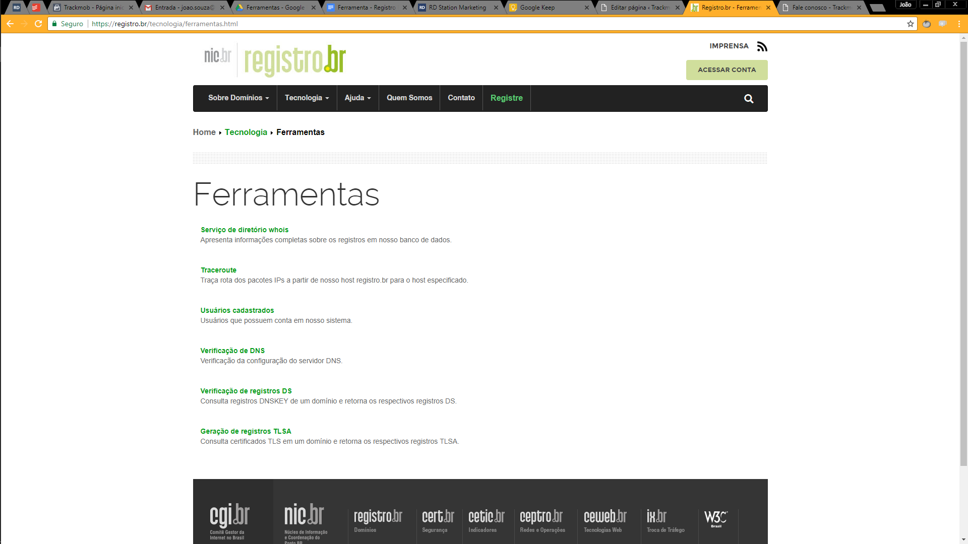 Essa barra de pesquisa que aparece é voltada a quem deseja registrar um domínio, portanto você não vai conseguir muita informação através dela. A ferramenta que vamos utilizar está na aba tecnologia —–> Ferramentas —–> Serviço de diretório Whois.