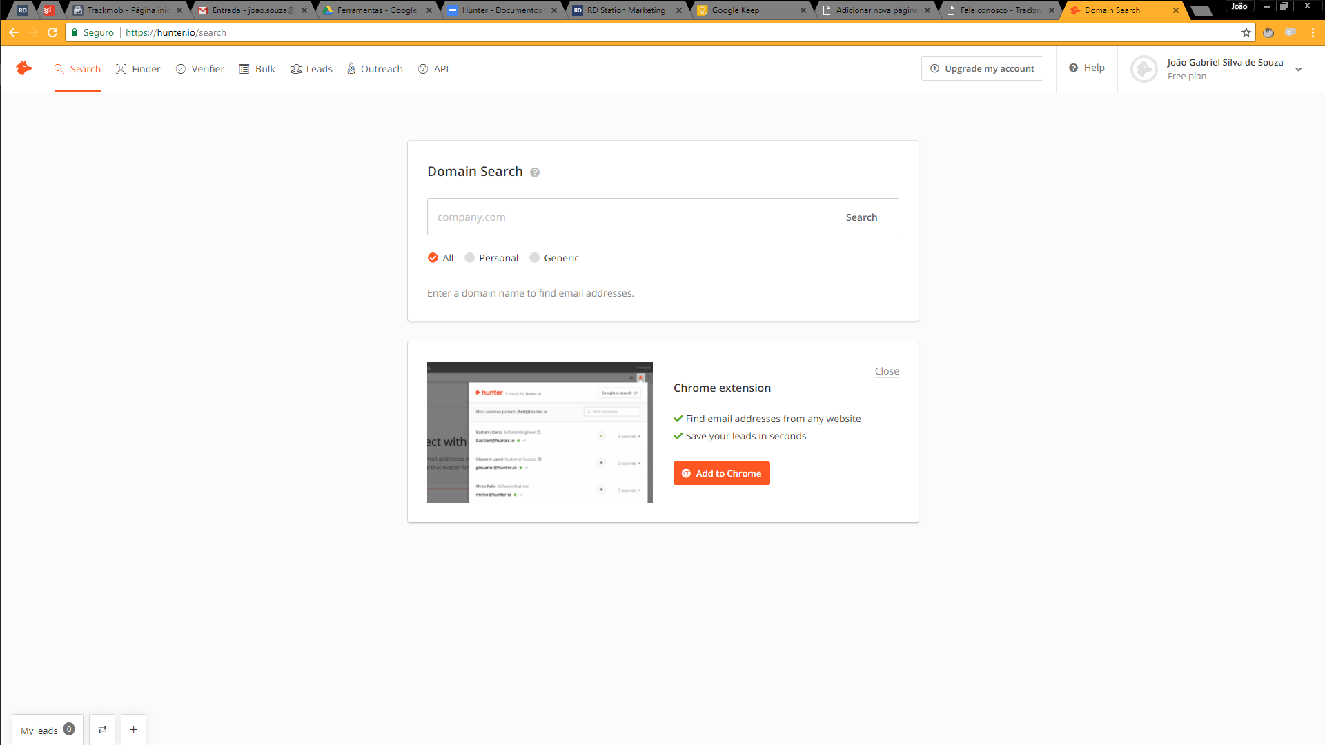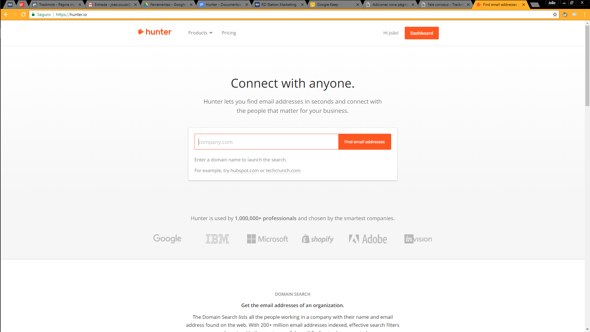 Achou um prospect sensacional, mas não consegue encontrar o e-mail de ninguém de lá, nem mesmo pelo Registro.br? A gente também tem uma alternativa para isso! Com o Hunter.io você consegue encontrar e-mails de pessoas ligadas a uma organização através do domínio.